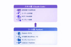 スキル層はClaude Codeが得意な「自然言語での記事執筆」「情報の要約・構造化」「ユーザーとの対話」を担当します。ツール層はPythonが得意な「API通信」「データの検証・保存」「テンプレート管理」を担当します。
